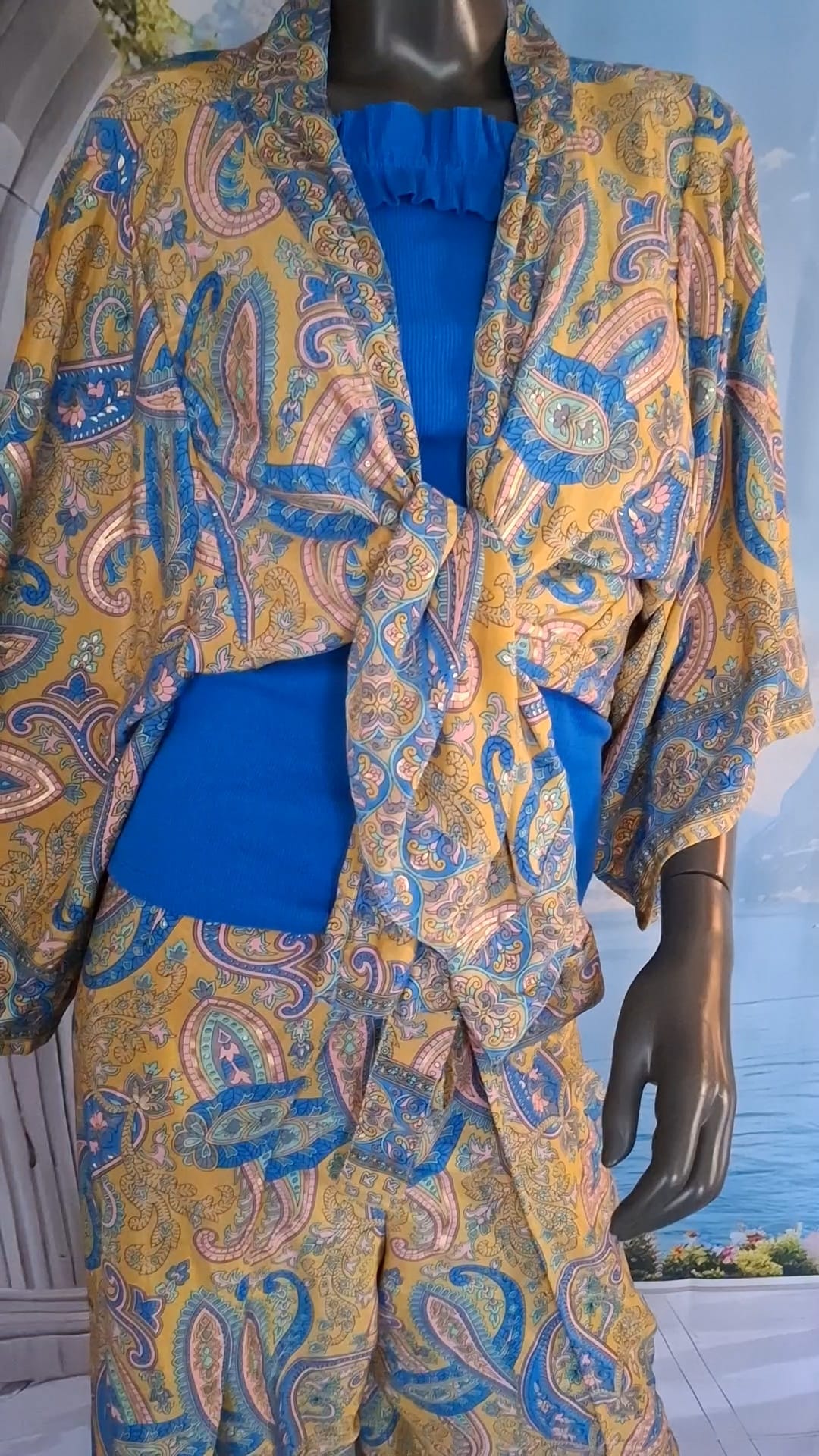 Wykonany ręcznie z najwyższej jakości wiskozy, jest nie tylko przyjemny dla skóry, ale też praktyczny i wszechstronny. Możesz nosić go jako komplet, który przyciągnie spojrzenia, lub osobno – spodnie dodadzą swobody Twoim stylizacjom, a kimono świetnie sprawdzi się jako narzutka, dodając szyku i koloru każdemu outfitowi.